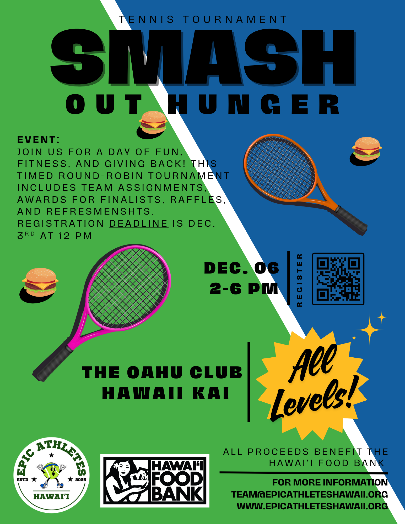 EPIC Athletes of Hawaii in partnership with The Oahu Club proudly presents the SMASH Out Hunger Tennis Tournament.
